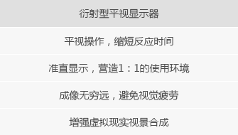 衍射型平视显示器采用全息投显技术设计实现,多用于机载或车载辅助驾驶系统中。将全息投显技术及现代信息处理技术相结合,它可以昼夜全天候工作,在车辆行驶时,将探测到的场景信息投射至驾驶员眼前方全息显示屏上,辅助驾驶员驾驶车辆。